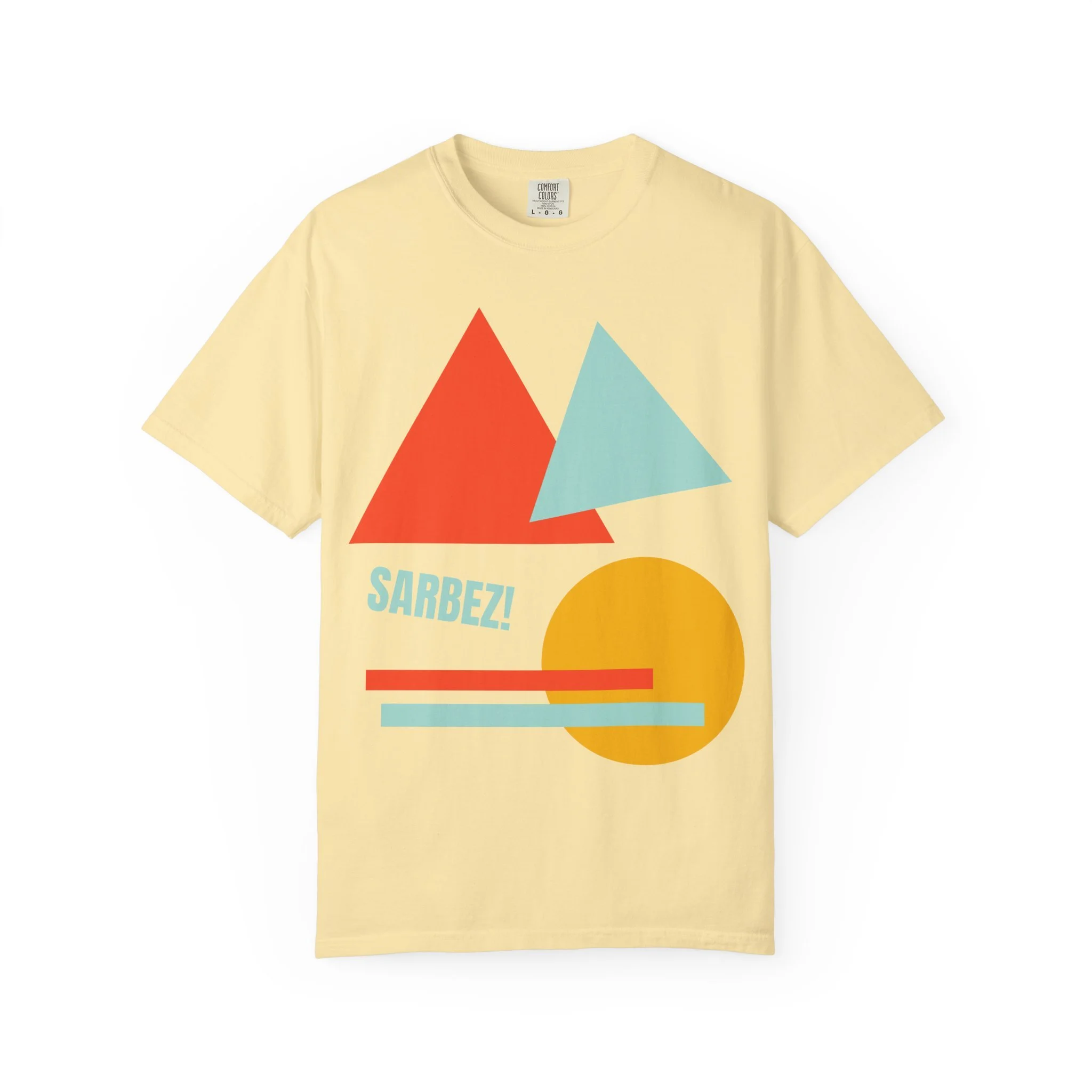 This relaxed-fit garment-dyed tee brings a sunlit, retro energy to everyday wear. The soft, broken-in fabric and muted, lived-in color make the geometric print feel like a found favorite — bright triangles, a warm sun, and bold stripes that read like a vacation memory. Wear it on slow mornings with faded denim, layered under an open shirt for evening bonfires, or packed for a weekend escape where comfort and color matter more than fuss. The heavy cotton and garment-dye give it weight and a soft hand that only improves with every wash.