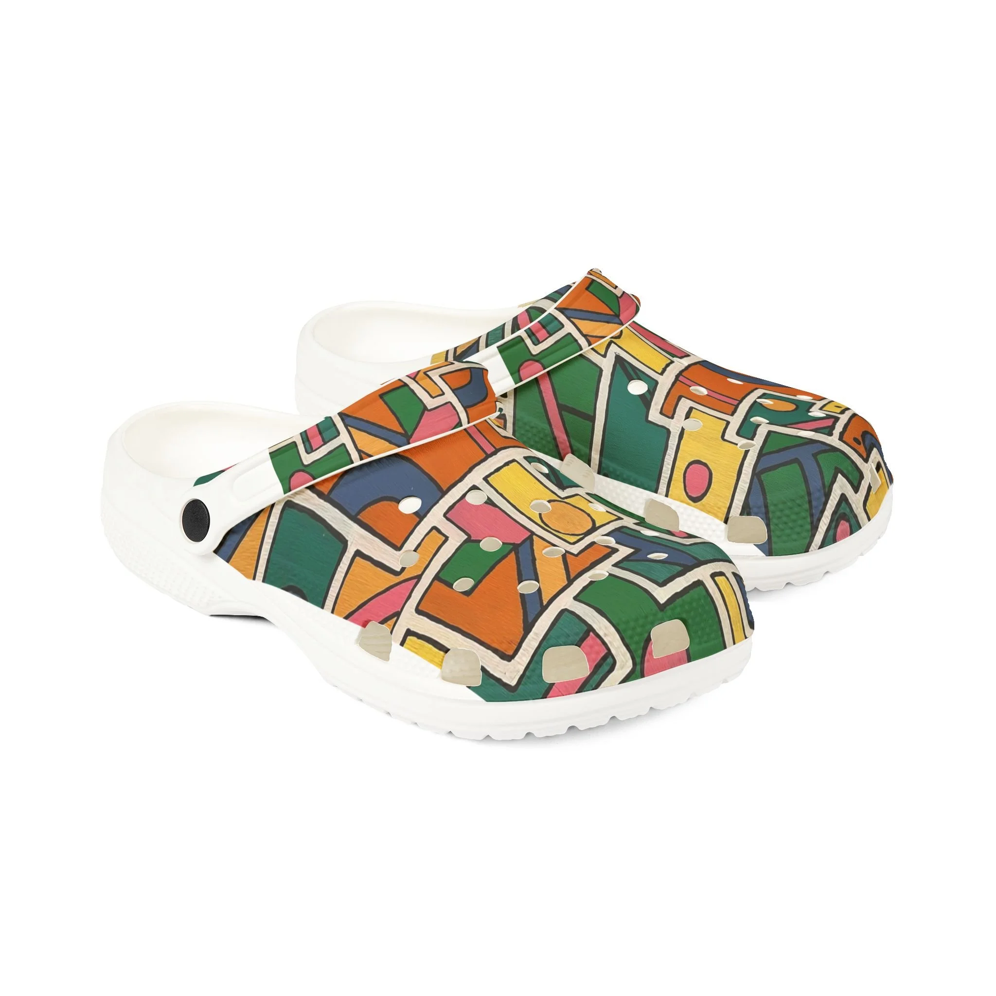 Step into color and comfort with these EVA foam clogs. The lively geometric pattern blends warm rusts, greens and sunny accents into a playful, modern mosaic that turns everyday wear into a small act of joy. Lightweight EVA construction cushions each step while the textured sole gives confident grip whether you’re padding around the house, running quick errands, or tending a garden. The adjustable strap keeps the fit secure and the printed surface keeps the style bold without being loud. Toss in a few accessory charms for a personal touch—these clogs feel like the kind of easy, cheer-filled footwear you reach for when you want both comfort and personality.